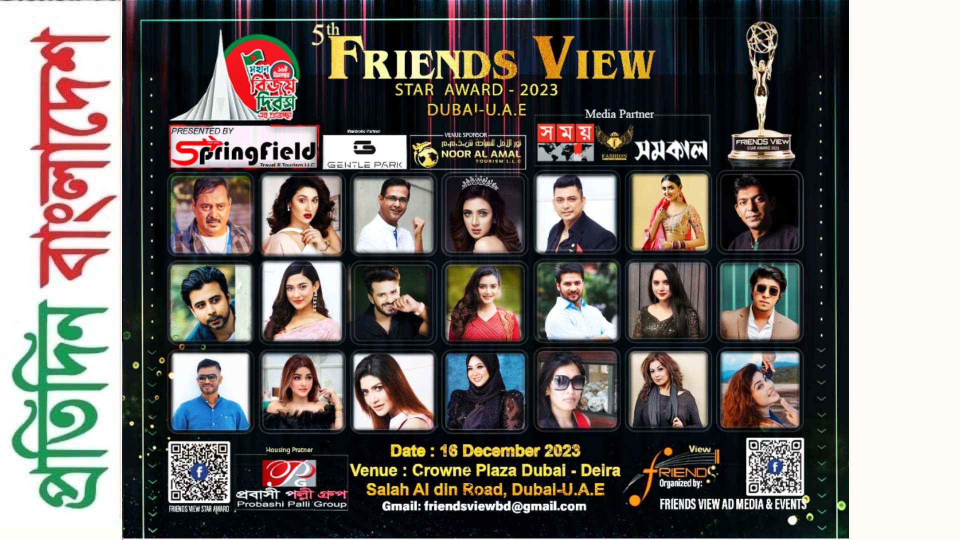 মহান বিজয় দিবস উপলক্ষে অনুষ্ঠিতব্য ‘ফ্রেন্ডস ভিউ স্টার অ্যাওয়ার্ড-২০২৩’ আয়োজনটি আগামী ১৬ ডিসেম্বর দুবাইয়ের পাঁচ তারকা মানের হোটেল ক্রাউন প্লাজায় অনুষ্ঠিত হবে বলে জানিয়েছেন আয়োজকরা।